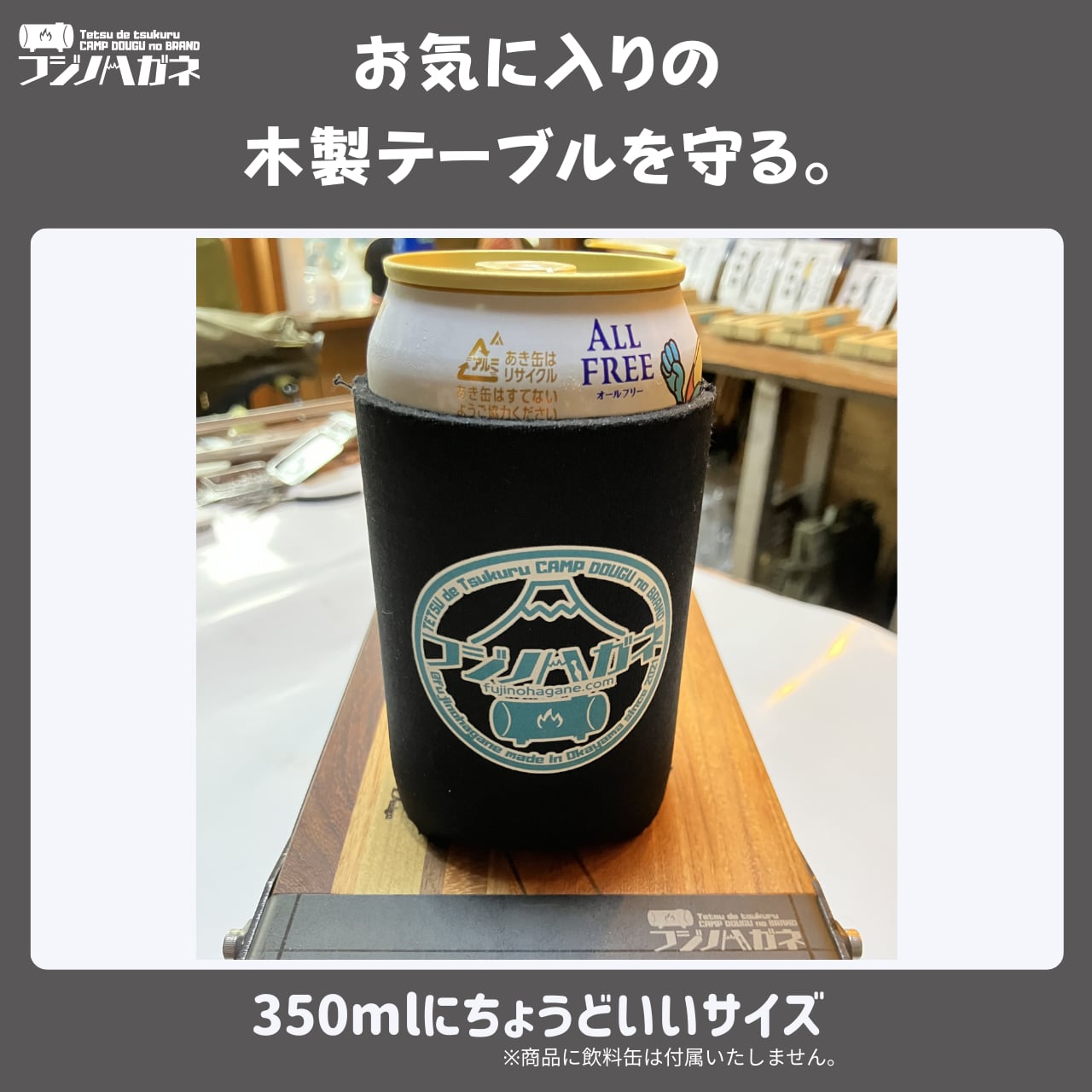 新商品のフレームテーブル「NIBURU」の上に、このクージーを履かせた缶を置く。